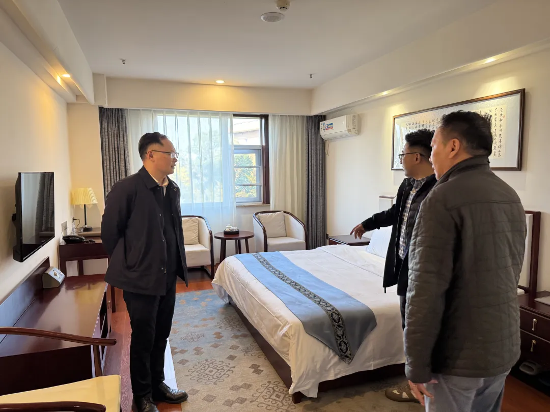 张智勇一行实地察看了客房、餐厅、后厨、会议场地及公共区域等重点场所,详细询问设施设备维护、服务流程规范、安全管理制度落实以及日常运营保障等情况,并就有关具体问题与现场管理人员进行交流,深入了解中心转制以来的实际运行成效与面临的挑战。